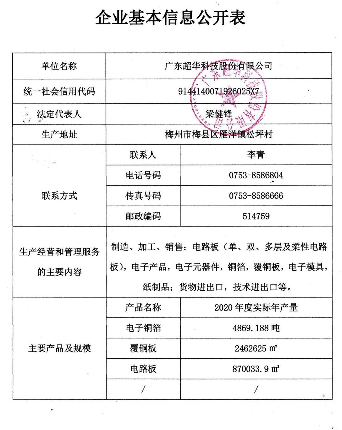 廣東超華科技股份有限公司2020年度固體廢物污染環(huán)境防治信息公示