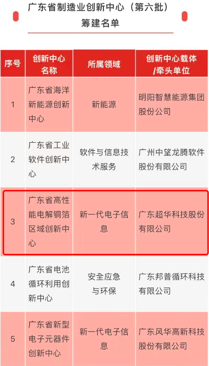 近日,廣東省工業(yè)和信息化廳公布了第六批廣東省制造業(yè)創(chuàng)新中心籌建名單,由廣東超華科技股份有限公司牽頭申報的廣東省高性能電解銅箔區(qū)域創(chuàng)新中心獲批建設(shè),為廣東制造業(yè)發(fā)展提供創(chuàng)新示范點。據(jù)了解,廣東省制造業(yè)創(chuàng)新中心是面向全省制造業(yè)創(chuàng)新發(fā)展需求,以重點領(lǐng)域前沿技術(shù)和共性關(guān)鍵技術(shù)的研發(fā)供給、轉(zhuǎn)移擴散和首次商業(yè)化為重點,由企業(yè)、科研院所、高校等各類創(chuàng)新主體自愿組合、自主結(jié)合,以企業(yè)為主體,以獨立法人形式創(chuàng)建的省級創(chuàng)新平臺,解決關(guān)鍵核心技術(shù)受制于人、產(chǎn)業(yè)共性技術(shù)供給不足、創(chuàng)新成果產(chǎn)業(yè)化不暢的問題,滿足廣東省新一代電子信息、新材料、智能制造、高端裝備制造、新能源汽車、生物醫(yī)藥等戰(zhàn)略性新興產(chǎn)業(yè)發(fā)展需求,助力制造業(yè)轉(zhuǎn)型升級,提高國家制造業(yè)創(chuàng)新能力。此次超華科技牽頭申報的廣東省高性能電解銅箔區(qū)域創(chuàng)新中心獲批建設(shè),也體現(xiàn)了超華科技深厚的技術(shù)底蘊和實力。